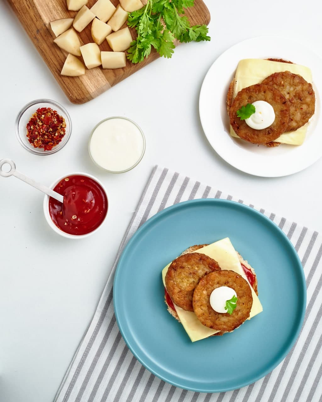 ● Top it with the fried Aloo Tikki.